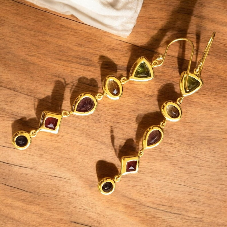 Add vibrant color and natural energy to your look with these handmade gemstone dangle earrings featuring a beautiful trio of Citrine, Amethyst, and Peridot stones, each set in solid 925 sterling silver.