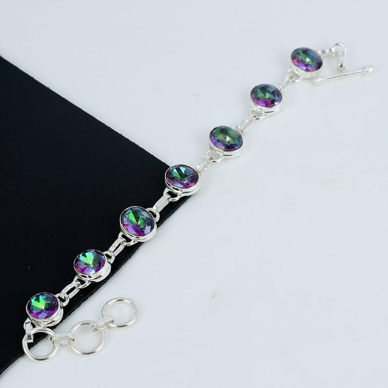 Add a touch of iridescent magic to your wrist with this stunning Mystic Topaz Bracelet, handcrafted in solid 925 sterling silver. Featuring faceted mystic topaz gemstones that shimmer in hues of green, purple, pink, and blue, this bracelet captures light from every angle, creating a dazzling rainbow effect.