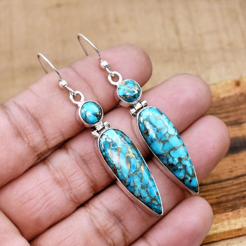Make a bold and beautiful statement with these Blue Copper Turquoise Dangle Earrings, handcrafted in 925 sterling silver. Featuring vibrant blue turquoise swirled with natural copper matrix, each stone is unique — showcasing stunning, earthy patterns that evoke the raw beauty of nature.